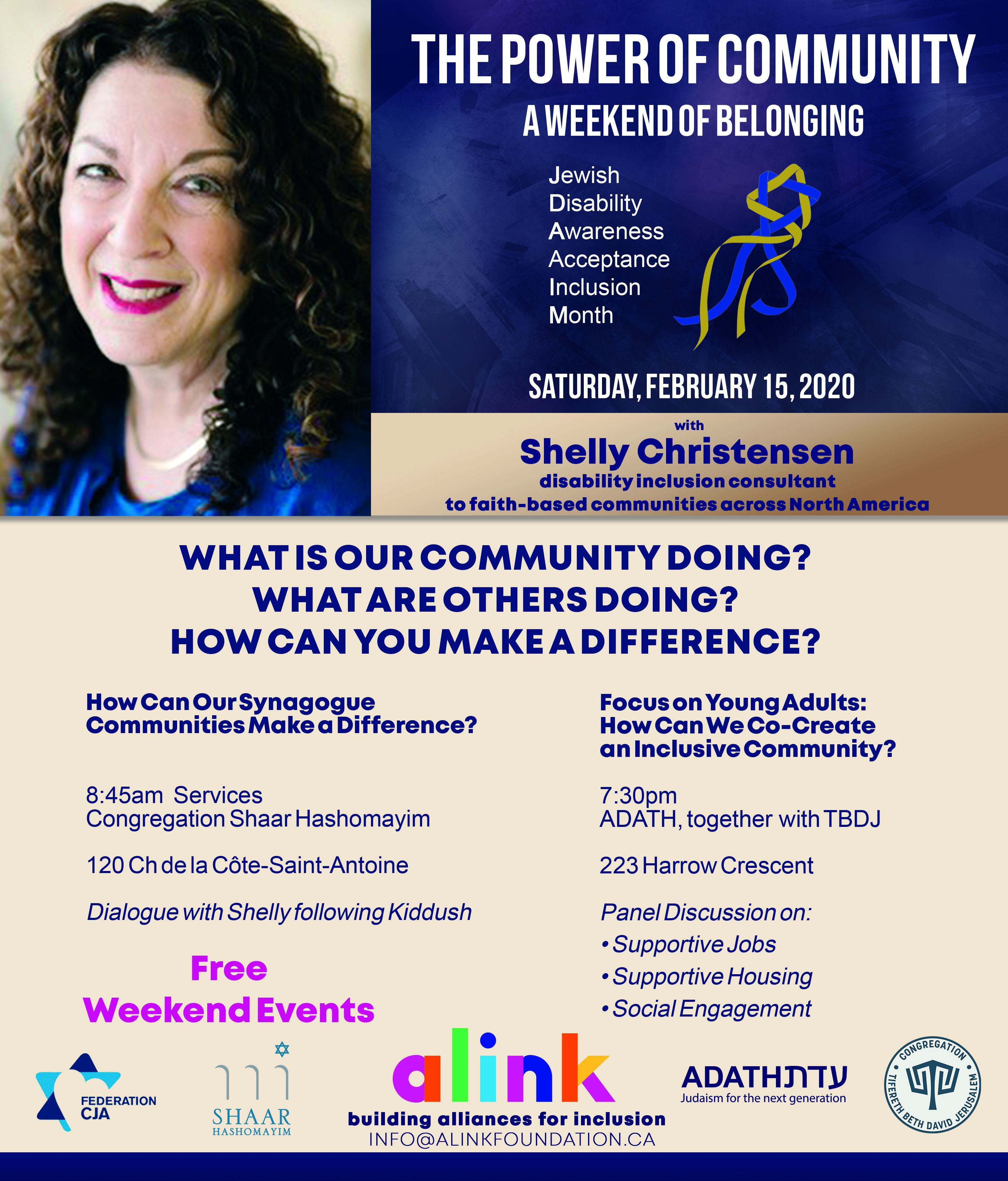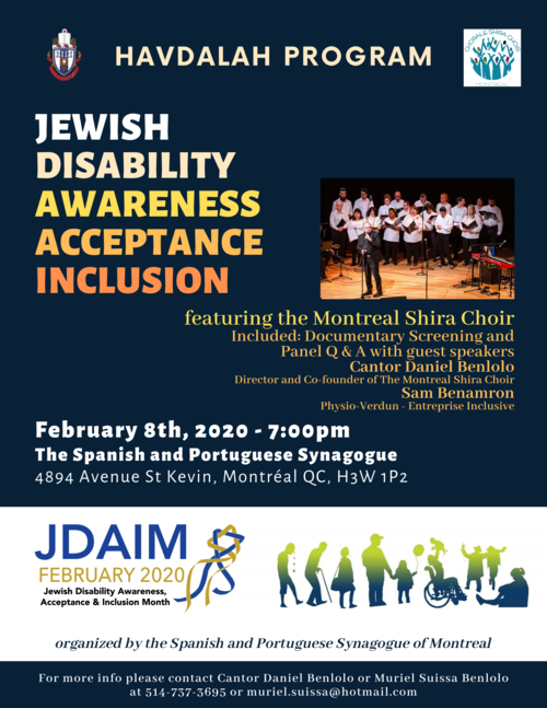 At the morning event there will be a keynote address by Sam Benamron from Physio-Verdun, an inclusive business for the past four years. Male Jewish choir members who have a wide range of disabilities will be integrated into the service with aliyahs to the torah or honours like opening the ark, followed by a congregational Kiddush. The keynote speaker will be.