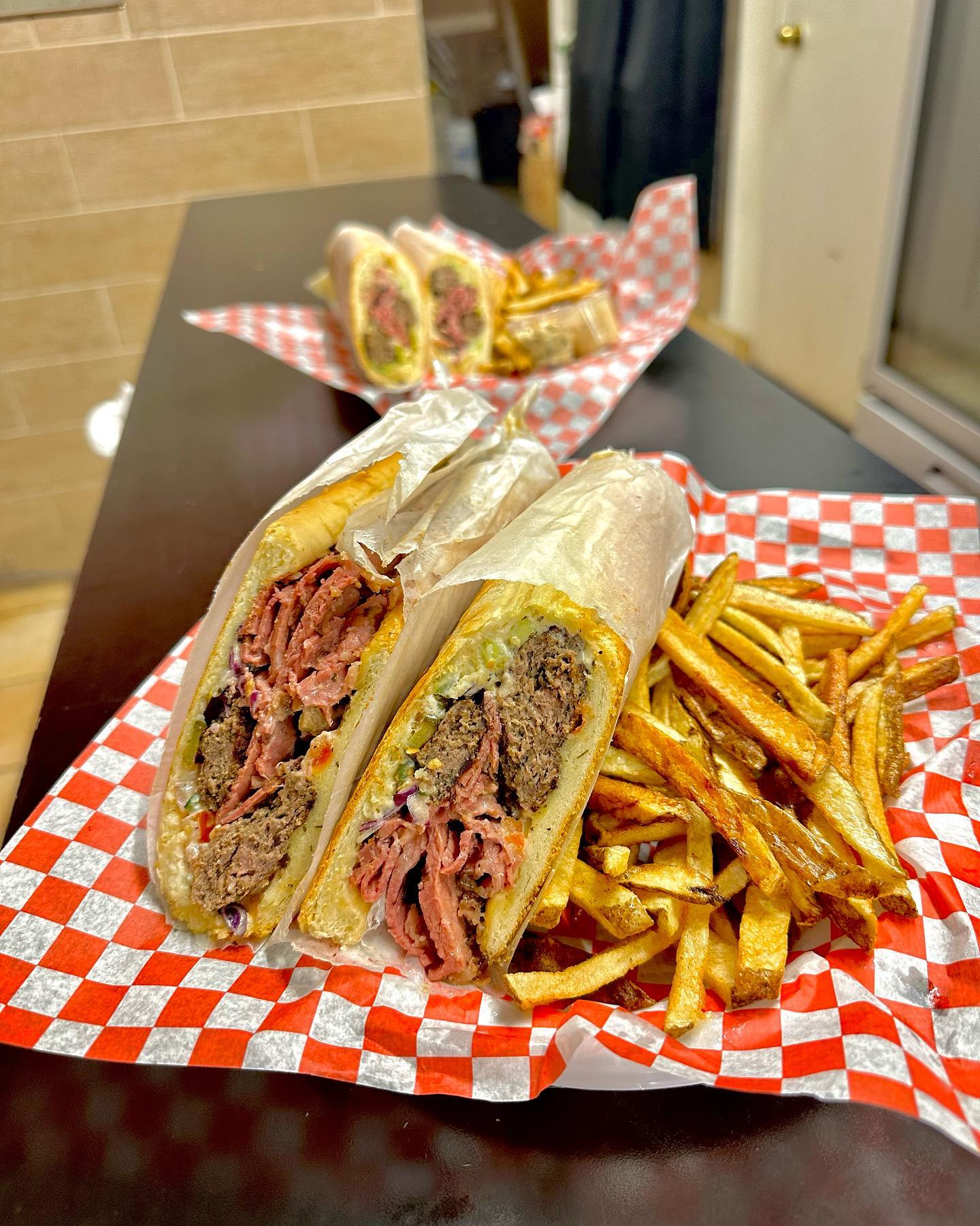 While the menu had some tantalizing items, I chose the smoked meat sandwich. This was a culinary delight featuring succulent slices of cured and smoked beef brisket, traditionally seasoned with a blend of aromatic spices. This sandwiches here are served on fresh rye bread or a baguette and grilled panini style. I opted for the latter format and it was fantastic. While Yosef was putting the sandwich together and placing it on a tray, with coleslaw, his mom appeared from the kitchen and added some crispy fries.